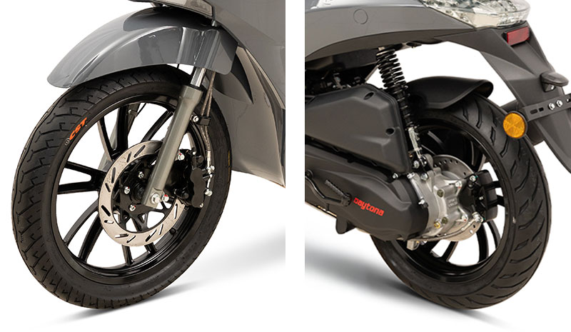 Η πέδηση του TREVIS 125 βασίζεται σε δίσκο 240 mm με τριπίστονη δαγκάνα εμπρός και δίσκο 205 mm με διπίστονη δαγκάνα πίσω, με σύστημα CBS. Η εικόνα ολοκληρώνεται με μεγάλους τροχούς 16” εμπρός και 14” πίσω, καθώς και πολυάκτινες, ελαφριές ζάντες αλουμινίου σύγχρονης σχεδίασης.